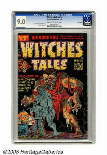 <B>Witches Tales #14 File Copy (Harvey, 1952) CGC VF/NM 9.0 Cream to off-white pages.</B></I> This black-background beauty is loaded with great cover color and gloss. Interior art is by Howard Nostrand, Rudy Palais, and Bob Powell. This is the better of the mere two copies of this issue currently certified by CGC. Overstreet 2005 VF/NM 9.0 value = $207; NM- 9.2 value = $270. CGC census 6/05: 1 in 9.0, none higher.