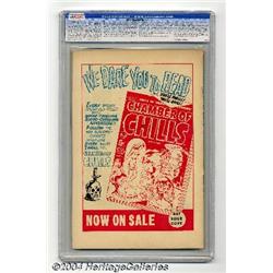 <B>Witches Tales #5 File Copy (Harvey, 1951) CGC VF+ 8.5 Cream to off-white pages.</B></I> Everyone wants to get "into stocks," but not like this! At least the poor fellow on the cover has a superb view of some "headlights." The eye-catching bondage scene looks like the work of Rudy Palais to us. The issue's interior art is by Palais and Bob Powell. It seems that #5 is one of the rarer issues -- it's the first time we've offered a copy of the book, and also the only unrestored copy that CGC has certified to date. Overstreet 2004 VF 8.0 value = $150; VF/NM 9.0 value = $210. <BR><BR><B>Important notice:</B> Heritage usually auctions material at the rate of 200-250 lots per hour. On some occasions eBay Live bid software or the Internet may not be able to keep up with the pace of the auction. We recommend placing a realistic absentee bid now as insurance to avoid disappointment. Occasionally the auctioneer may eliminate or reject an eBay Live bid, and the auctioneer may also reopen a lot after the close of the eBay live bidding (usually because we missed an audience bid), and may reject your bid even if it shows you as the winning bidder. By bidding via eBay Live, you agree that Heritage may award the lot to another bidder at its sole discretion under the circumstances described above or any other reasonable circumstances. Since eBay bids are not shown to us until we open the lot on the floor, we treat those bids just like floor bids. In most cases the floor responds before the eBay bid is presented to us, due to Internet lag time, so for consistency we have made it a policy that floor bids are always considered first over tie eBay live bids. Also please note that all Heritage lots purchased through eBay Live carry a 20% Buyer's Premium. Please make sure you read the Terms and Conditions before you bid.