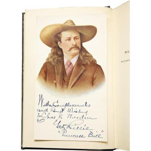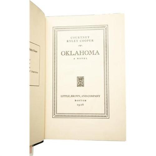 <B>Gordon William Lillie Pawnee Bill : Color Photo Card Inscribed by Pawnee Bill in <I>Oklahoma.</B></I></B></I><B> A Novel, by Courtney Ryley Cooper.</B></I> (Boston: Little, Brown, 1926). First edition. Octavo (7.5” x 5”). 303 pp. Publisher's dark blue cloth lettered in a lighter blue-green on the front cover and spine. Top edge stained green. A fine copy, housed in a custom quarter morocco book-back slipcase. The book is dedicated by Cooper: “<I>To Major Gordon W. Lillie (Pawnee Bill) without whose name no story of Oklahoma could be complete.</B></I>” Inscribed photograph is mounted opposite the dedication on the copyright page. Lillie learned the Pawnee language and billed himself as the “white chief of the Pawnees.” Lillie met Wild Bill Cody and worked for a brief time as a translator for the Pawnee Indians appearing in Cody's Wild West Show. Lillie later organized two wild west shows of his own, the first failing in less than a year. The second show prospered and toured for 20 years, occasionally in Europe. He was later a partner with Cody after their shows merged. Lillie is buried at Pawnee.<BR><BR><b>Shipping:</b> Books & Catalogs (<a target="_blank" href="http://www.heritageauctions.com/common/shipping.php">view shipping information</a>)