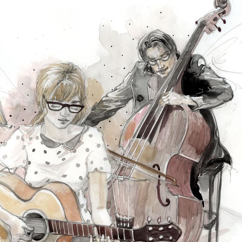 "With Maestro" is an original painting, mixed media (ink and gouache) on vellum art paper, by Lena Sotskova. This piece is hand signed by the artist, hand titled, and accompanied by a certificate of authenticity. Measures approximately 14" x 17".
