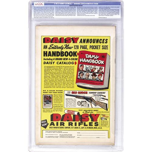 <B>Witness #1 Davis Crippen ("D" Copy) pedigree (Marvel, 1948) CGC VF/NM 9.0 Off-white to white pages.</B></I> The Crippen collection includes some of the toughest of the Timelys, take this one-shot, which Overstreet and Gerber both call "scarce." It's the first appearance of the Witness (a different character than the Witness who was in <B>Mystic</B></I> previously), and while there was only one issue of this series, the mysterious host character did crop up in other Timely books subsequently. Syd Shores and Ken Bald contributed interior art to the issue. Overstreet 2006 VF/NM 9.0 value = $2,047; NM- 9.2 value = $2,800. CGC census 6/06: 1 in 9.0, 1 higher. <I>From the Crippen Collection.</B></I> <BR><BR><B>Important notice:</B> Heritage usually auctions material at the rate of 200-250 lots per hour. On some occasions eBay Live bid software or the Internet may not be able to keep up with the pace of the auction. We recommend placing a realistic absentee bid now as insurance to avoid disappointment. Occasionally the auctioneer may eliminate or reject an eBay Live bid, and the auctioneer may also reopen a lot after the close of the eBay live bidding (usually because we missed an audience bid), and may reject your bid even if it shows you as the winning bidder. By bidding via eBay Live, you agree that Heritage may award the lot to another bidder at its sole discretion under the circumstances described above or any other reasonable circumstances. Since eBay bids are not shown to us until we open the lot on the floor, we treat those bids just like floor bids. In most cases the floor responds before the eBay bid is presented to us, due to Internet lag time, so for consistency we have made it a policy that floor bids are always considered first over tie eBay live bids. Also please note that all Heritage lots purchased through eBay Live carry a 22.5% Buyer's Premium. Please make sure you read the Terms and Conditions before you bid. This lot is being auctioned in conjunction with a live floor auction by Heritage Auction Galleries. All final auction and invoice information will be supplied by Heritage Auction Galleries, and all other information should be considered preliminary. Lot:41001 <BR><BR><B>Winning Notification and Billing:</B> After the FINAL session in this auction is complete, Heritage will send e-mail and snail mail invoices. This process normally takes several days. All final auction and invoice information will be supplied by Heritage Auction Galleries, and all other information should be considered preliminary. <BR><BR>This auction will be conducted on a live auction floor and over the Internet through eBay Live. If you choose to place an absentee bid, please take a moment to <font color='#0000ff'><u><a href='http://pages.ebay.com/liveauctions/help/before/laabsentee.html'>learn how eBay Live absentee bidding works</a></u></font><font color='#000000'>