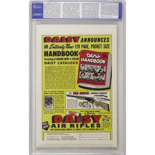 <B>Witness #1 Vancouver pedigree (Marvel, 1948) CGC NM 9.4 White pages.</B></I> This dynamite copy had us typing "Mile Hig..." until we noticed that it's actually one of the Vancouver books. As more collectors start noticing the white pages of the incredible Vancouver collection, we expect multiples of Guide to become the norm. This Timely is called "scarce" by both Overstreet and Gerber. This one-shot has the first appearance of the Witness (a different character than the Witness who was in <B>Mystic</B></I> previously). Overstreet 2006 NM- 9.2 value = $2,800. CGC census 10/06: 1 in 9.4, none higher.<BR><BR><b>Shipping:</b> Slabbed Comic (<a target="_blank" href="http://www.heritageauctions.com/common/shipping.php">view shipping information</a>)