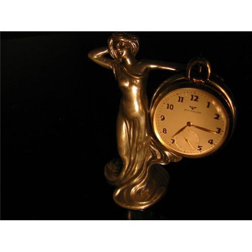 This gorgeous 17 jewel pocket watch is from Swiss Wittnauer in art deco style 2 inch in diameter. Holder sold separately. This pocket watch is goldtone and has numeric in gold and logo of watch maker Wittnauer. covered with clear glass and is in excellent condition. It has goldtone hardware hook to use as pendant or attach a fob for waistline. It is in perfect working condition. WITTNAUER WATCH CO. INC. 17 JEWLES SWISS65 REVUE - Undercover indicates: WITTNAUER NEW YORK GENEVA MONTREAL STAR W.C. CO. 10K. GOLD FILLED 2294-17T. 4277143. This watch is collectible and incredible.