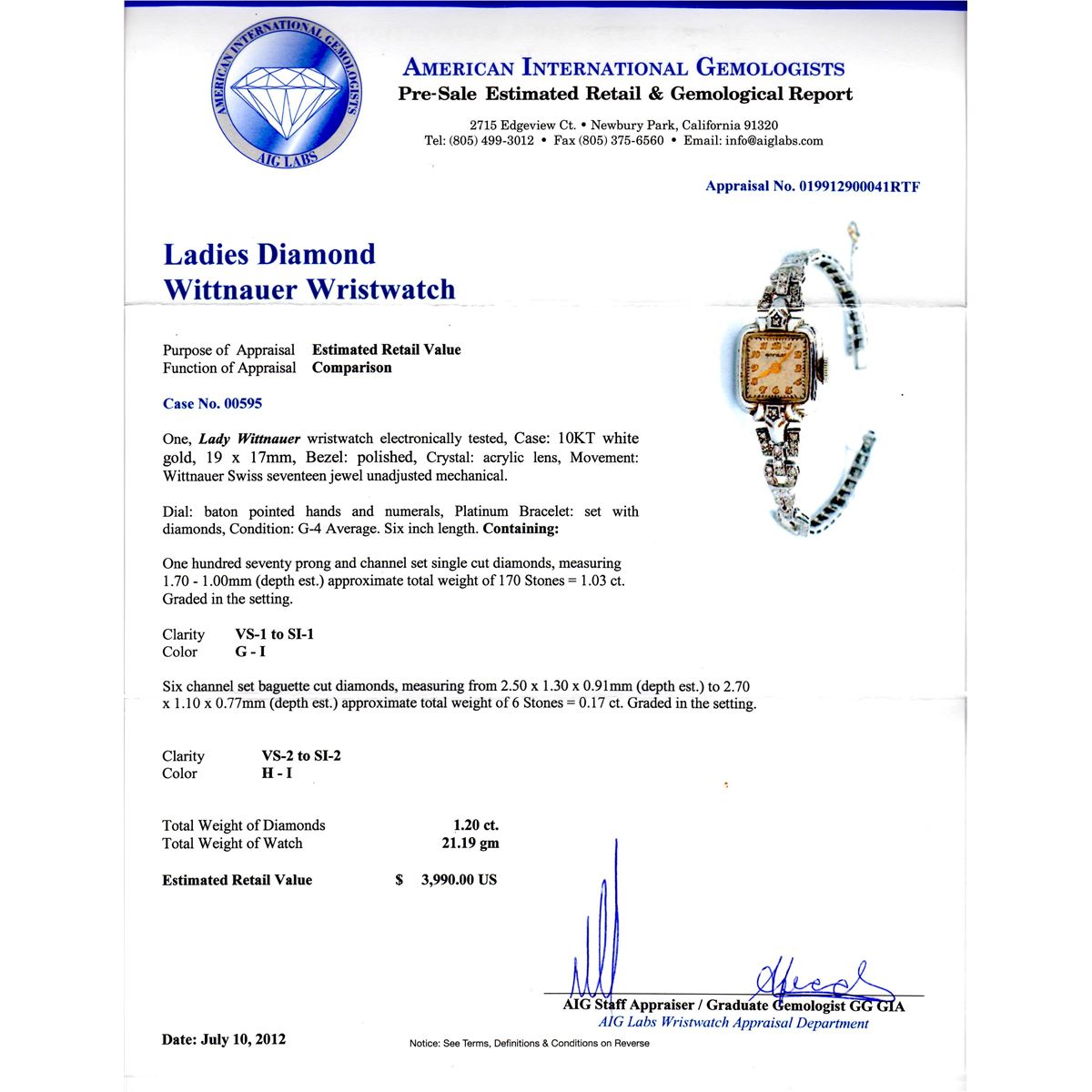 One ladies Wittnauer wristwatch electronically tested, case: 10KT white gold, 19 x 17mm, bezel: polished , crystal: acrylic lens, movement: Wittnauer swiss seventeen jewel unadjusted mechanical. Dial: baton pointed hands and numerals and numerals, platinum bracelet: set with diamonds, condition is G-4 average. Six inch length. Containing: One hundred seventy prong and chanel set single cut diamonds, measuring 1.70 x 1.10 x 0.77mm (depth est.) approximate total weight of 170 stones = 1.03ct. Graded in the setting. Clarity VS-1 to SI-2. Color G - I. Six chanel set baguette cut diamonds, measuring from 2.50 x 1.30 x 0.91mm (depth est.) approximate total weight of 6 stones = 0.17ct. Graded in the setting. Clarity VS-1 to SI-2. Color H - I. Total weight of diamonds 1.20ct. Total weight of watch 21.19gm. AIG Appraised at $3,990.00.