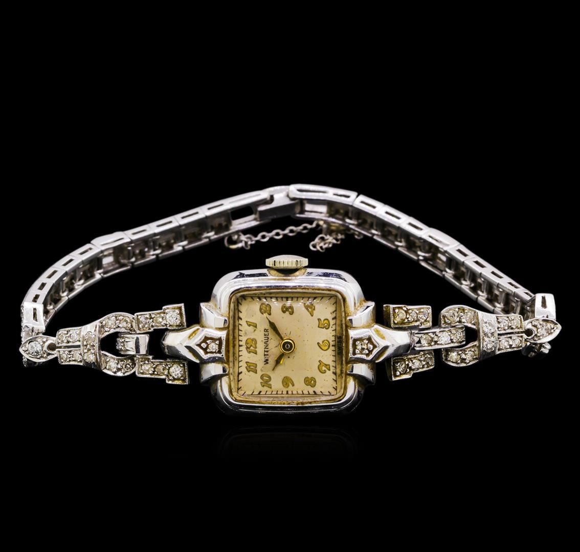 One ladies Wittnauer wristwatch electronically tested, case: 10KT white gold, 19 x 17mm, bezel: polished , crystal: acrylic lens, movement: Wittnauer swiss seventeen jewel unadjusted mechanical. Dial: baton pointed hands and numerals and numerals, platinum bracelet: set with diamonds, condition is G-4 average. Six inch length. Containing: One hundred seventy prong and chanel set single cut diamonds, measuring 1.70 x 1.10 x 0.77mm (depth est.) approximate total weight of 170 stones = 1.03ct. Graded in the setting. Clarity VS-1 to SI-2. Color G - I. Six chanel set baguette cut diamonds, measuring from 2.50 x 1.30 x 0.91mm (depth est.) approximate total weight of 6 stones = 0.17ct. Graded in the setting. Clarity VS-1 to SI-2. Color H - I. Total weight of diamonds 1.20ct. Total weight of watch 21.19gm. AIG Appraised at $3,990.00.
