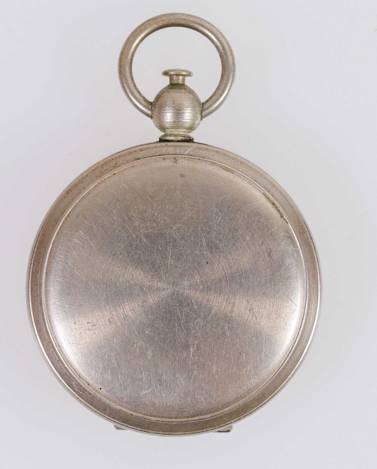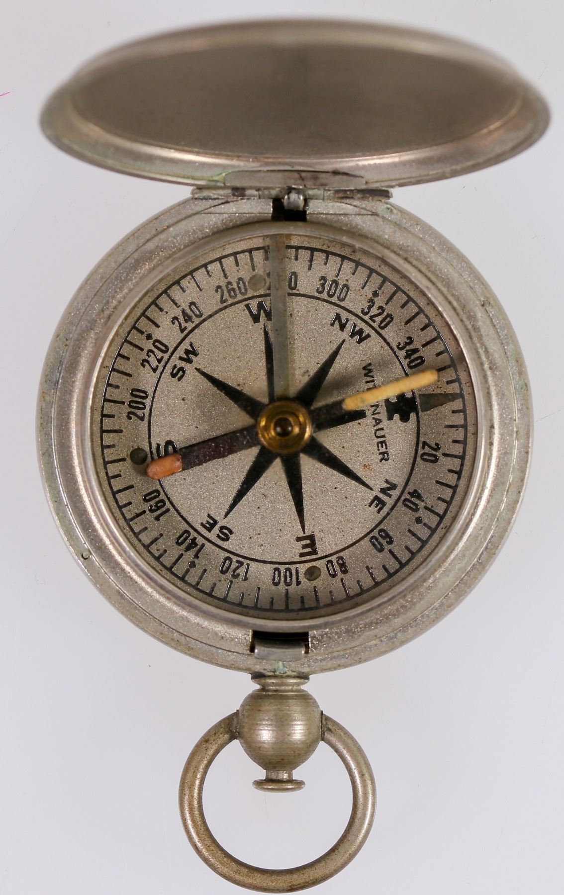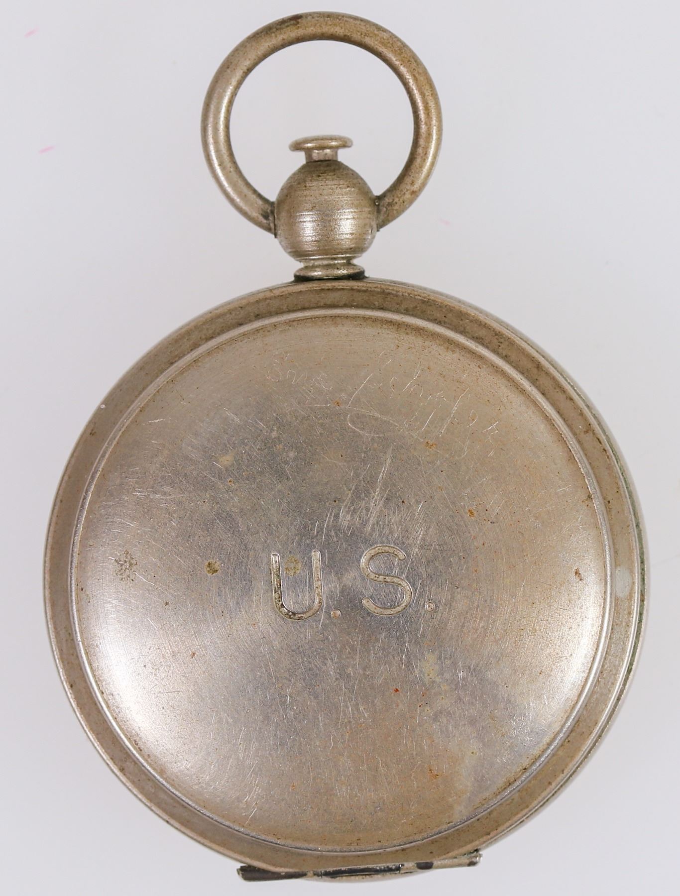 This pocket compass was made by Wittnauer about 1900. It is 1.875 in. in diameter with a bail loop, push button cover release, and open lid needle release. Engraved "U.S." on the cover used in WW1. A minor blemish dent on the top cover. Please see photos for details.