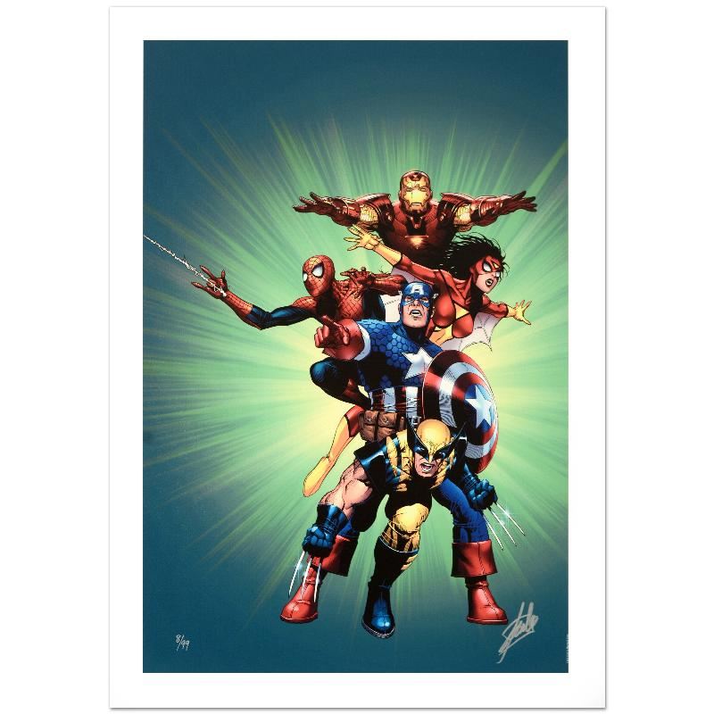 A piece of comic book history, this limited edition, from original art by Jim Cheung, depicts the classic characters Wolverine, Captain America, Spider Woman, Spider-Man and Iron Man. Jim Cheung was named as one of 2005's "Young Guns" by Marvel Editor-in-Chief, and has been described as a "future superstar penciller". "Wizard # 136" is alimited edition giclee on canvas by Jim Cheung presented by Marvel Comics, numbered and hand signed by the great Stan Lee! Includes Certificate of Authenticity! Measure approx. 18" x 27" (image).