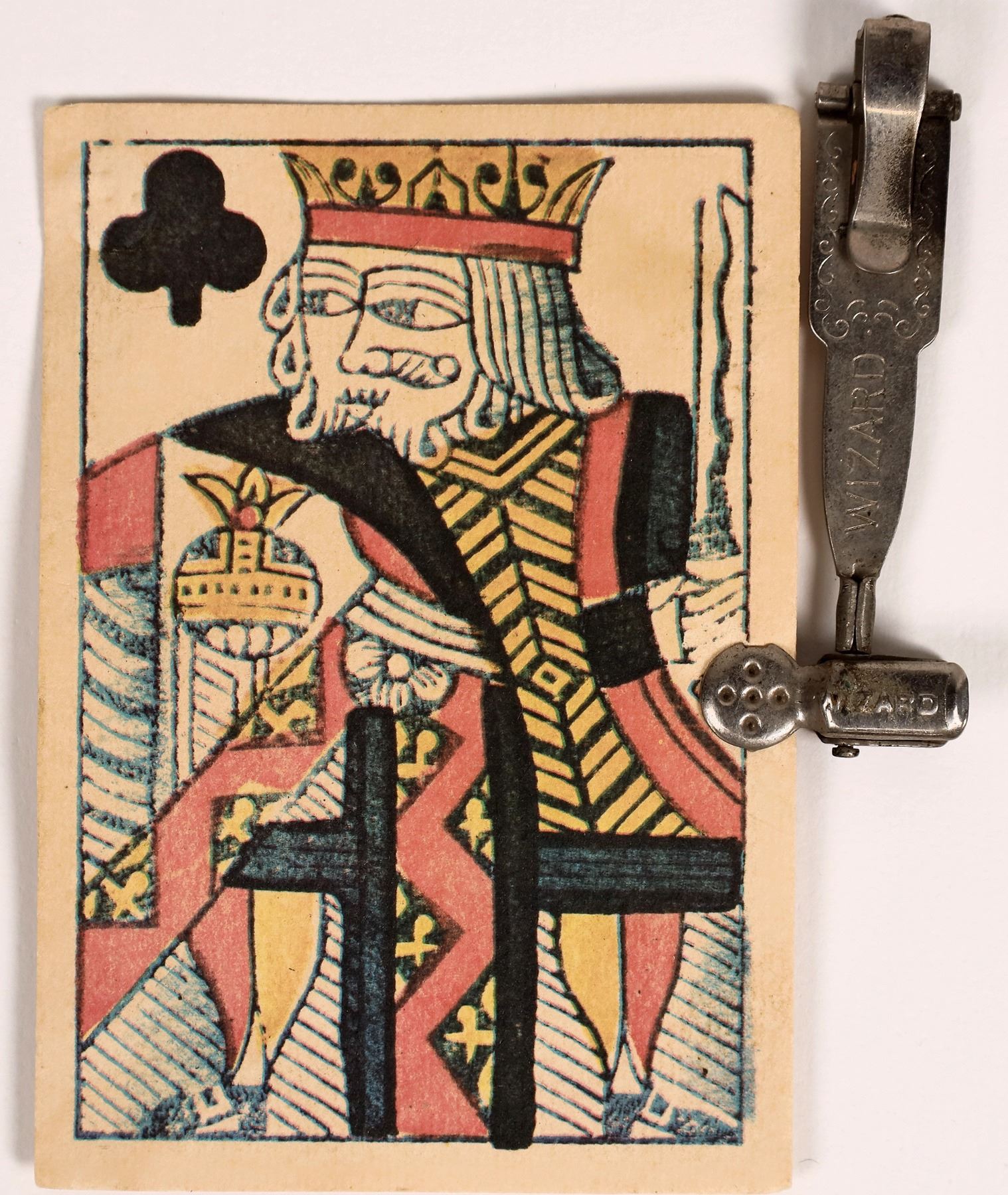 Metal Wizard card cheating card holder with King of Clubs card, as used by cheaters to hold cards up their sleeve. Last patent date on back May 1, 1906. About 2.5x1". Jim & Barbara Sherman Private Western Mining Museum