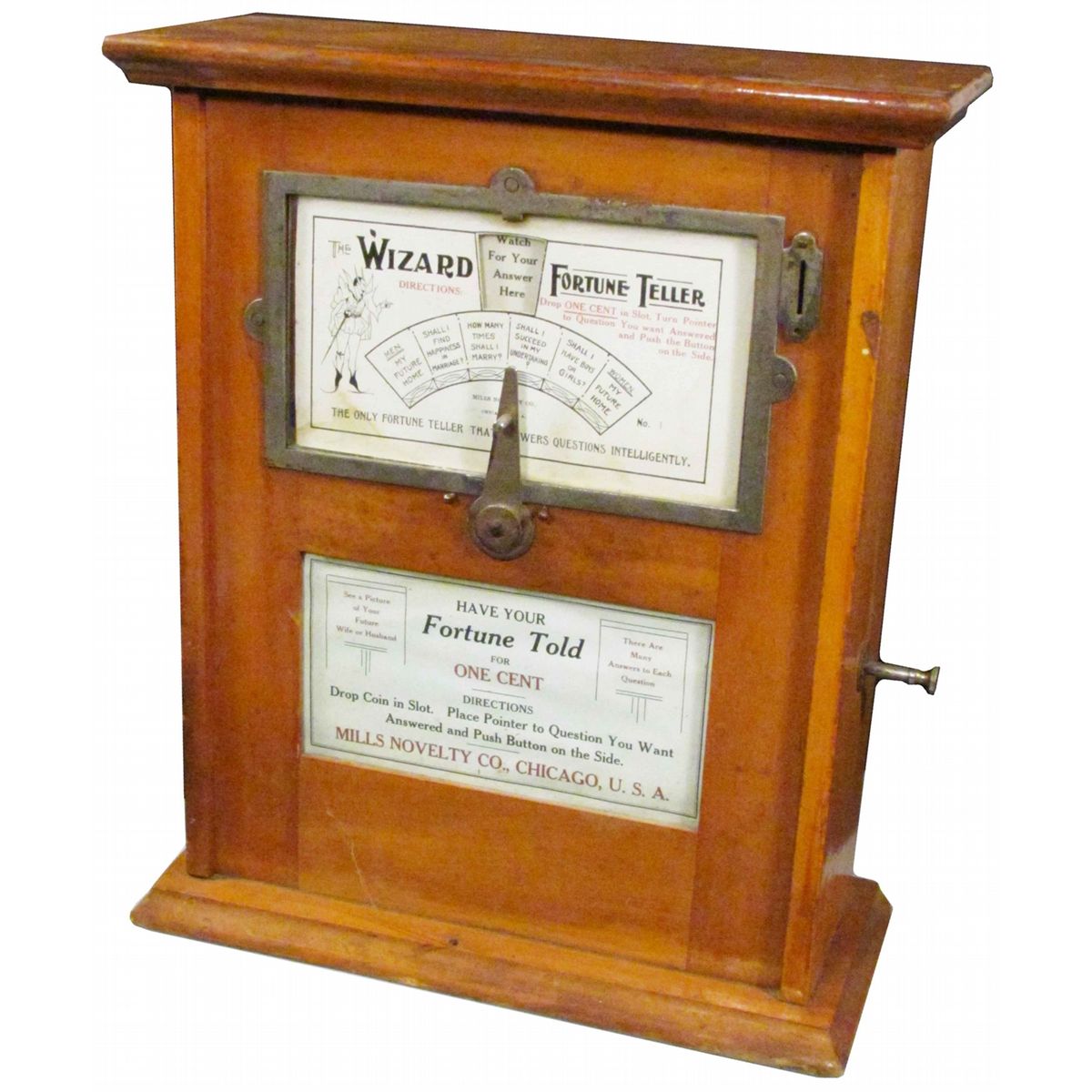 Wizard Fortune Teller Trade Stimulator. Mfg. by The Mills Novelty Co. Chicago. Very good original working condition, comes with keys. 14 X 6 1/2 X 6 inches.