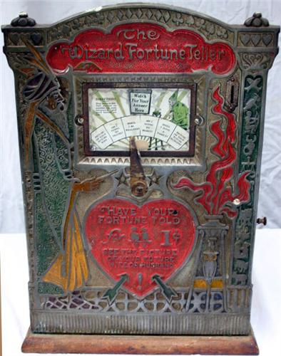 The Wizard Fortune Teller in original condition. Nice graphics, nice color and embossing on metal, original key. Have your fortune told for one cent.