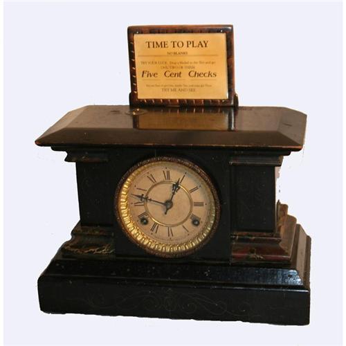 Gambling Clock - Wooden case measures approximately 14" x 6" x 10" H plus 4 ½" marquee.  Works on nickel.  Unrestored condition.