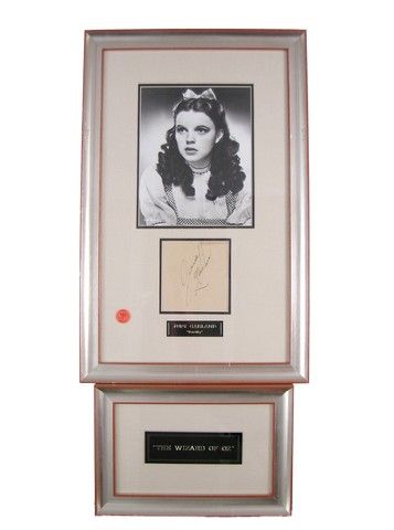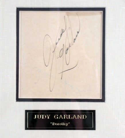 Wizard Of Oz Dorothy (Judy Garland) Autographed Display - From the special full set of autographs of the principal players in the ultimate classic "The Wizard of Oz" (1939) comes this beautifully framed and triple-matted display including a rare early personal autograph of Judy Garland, a B&W Photo of Judy in her part as Dorothy, and a specially engraved plaque reading: "Judy Garland - Dorothy". Also includes is a separate display frame including the original "The Wizard Of Oz" engraved nameplate for the full classic collection of autographs. Autograph 4.5"x5", photograph 7"x9", plaque 3.5"x1". Display frame includes Plexiglass and is approx 14"x22". "Wizard Of Oz" plaque is approx 6"x2.5" in a double-matted frame 12"x8".