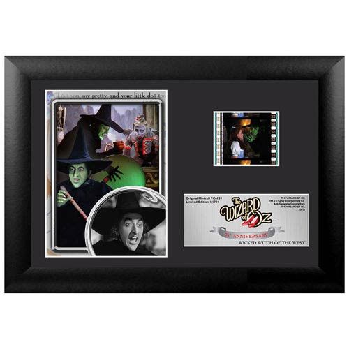 Framed & Matted - Celebrate the 75th anniversary and bring home this official limited edition collectible that contains a classic image of the Wicked Witch of the West in Wonderland! Bring home The Wizard of Oz with this framed FilmCell presentation that also boasts a clip of real film from the movie. The Wizard of Oz was a milestone motion picture in 1939. Breaking theater attendance records across North America and winning almost unanimous critical acclaim. You can proudly celebrate the 75 years that this timeless classic has endured, through changing tastes in music, entertainers and entertainment, to become a cornerstone of American popular Folklore. Measures 7-inches wide x 5-inches tall in a black mdf frame (medium-density fiberboard) and comes with an embossed/foiled certificate of authenticity. A limited edition of 1,750 pieces.