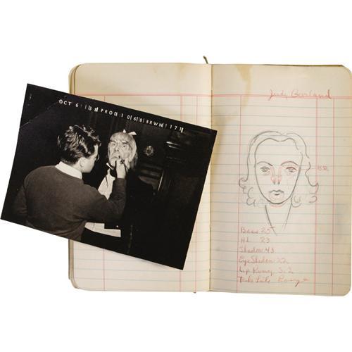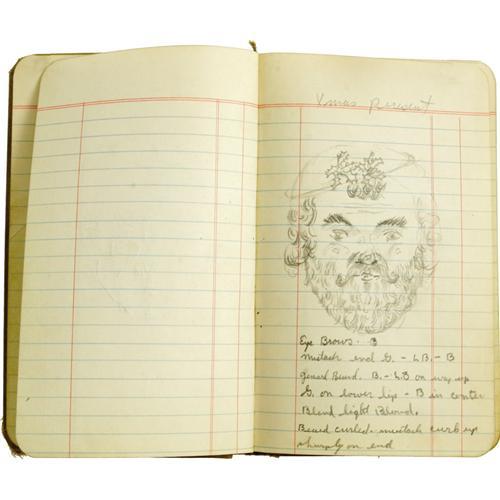 <B>Emile LaVigne Make-Up Sketch Book from 1938, Noting his Uncredited Work on "The Wizard of Oz".</B></I> Two of MGM's most beloved productions were <I>A Christmas Carol</B></I> (1938) and, of course, <I>The WIzard of Oz</B></I> (1939). This small journal features a number of make-up design sketches and handwritten notes by LaVigne for uncredited work he did on both these classic films in 1938. The pages feature notes regarding designs for Nelson Eddy, Gene Lockhart, Ray Bolger, Judy Garland, and Fay Bainter, as well as a b&w 5" x 3.5" photo of make-up being applied to Leo G. Carroll for his role as the ghost of Jacob Marley. The journal is in overall Very Fine condition with mild to moderate wear to the cover and clean, white pages; the photo is in Excellent condition with very mild wear and handwritten notes on the back. A wonderful <I>Oz</B></I> artifact!<I>From the estate of Emile LaVigne.</B></I><BR><BR><b>Shipping:</b> Books & Catalogs (<a target="_blank" href="http://www.heritageauctions.com/common/shipping.php">view shipping information</a>) <BR><BR><B>Importa