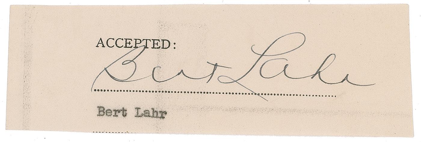 Vintage ink signature, “Bert Lahr,” on a 4.5 x 1.5 slip clipped from a larger document. In fine condition, with slightly irregular edges.