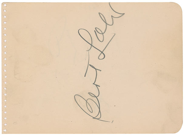 Vintage pencil signature “Bert Lahr” on an off-white 4.5 x 6 album page. Wrinkling, light soiling, and show-through from a signature on the opposing side, otherwise fine condition.