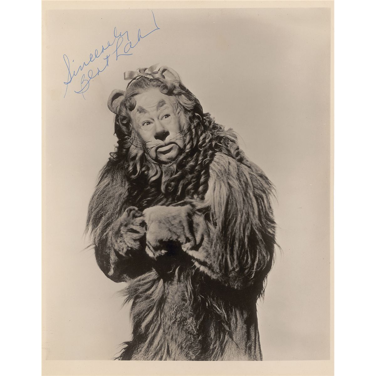 Scarce and extremely sought-after glossy 7.75 x 10 photo of Lahr as the Cowardly Lion, signed in blue ballpoint, “Sincerely, Bert Lahr.” In fine condition, with slightly trimmed vertical edges and a few surface impressions to background. Uninscribed portraits of Lahr in his iconic role are becoming increasingly difficult to find.