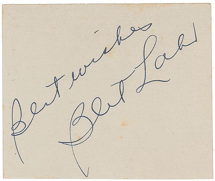 Vintage ink signature, "Best wishes, Bert Lahr,” on an off-white 3.5 x 3 card. In fine condition.