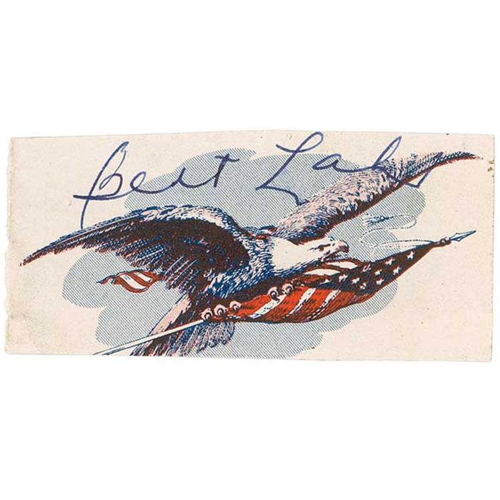 Ink signature on an off-white 3 x 1.5 slip clipped from a Defense Stamps booklet. In fine condition, with scattered light soiling. Pre-certified PSA/DNA and RRAuction COA.