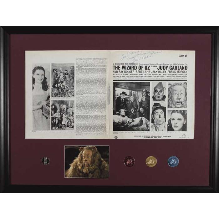 Wizard of Oz soundtrack album signed and inscribed in blue ballpoint on the inside gatefold, “To David from the ‘Cowardly Lion,’ Bert Lahr.” Matted and framed with a color photo of Lahr as the Lion, and four commemorative medallions, to an overall size of 30.25 x 23.25. Accompanied by a letter of provenance from the daughter of the original owner, Hollywood’s Tony Thomas. She writes, in part: “My dad interviewed countless Hollywood personalities. He wrote 31 books on Hollywood history…The album you received was autographed to my brother…I’m not sure on how many occasions my dad met Burt [sic] Lahr, but he undoubtedly interviewed him.” In fine condition, with tape repair and paper loss to hinge, small ink notations, and a bit of light edge toning. Oversized. Pre-certified PSA/DNA and RRAuction COA.