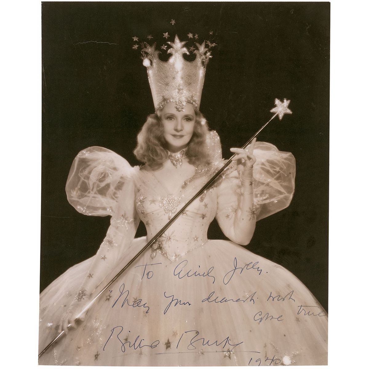 Fantastic and practically nonexistent vintage matte-finish 7.25 x 9 photo of Burke as Glinda the Good Witch of the North, signed and inscribed in fountain pen to the wife of character actor I. Stanford Jolley “To Emily Jolly, May your dearest wish come true, Billie Burke, 1940.” Lightly trimmed edges, some scattered light bends and creases to edges and background, and some light surface marks, otherwise fine condition.