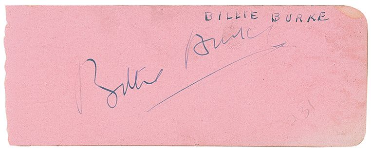 Vintage fountain pen signature, “Billie Burke,” on a pink 5.75 x 2.25 album page. In very good condition, with staining and soiling, some irregular ink flow, collector notation at the top edge approaching her name, and light show-through from signature on opposing side.