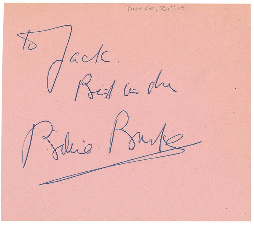 Ballpoint signature and inscription, “To Jack, Best wishes, Billie Burke,” on a light pink 5 x 4.5 album page with pencil collector’s notation to the top border. In fine condition, with mild toning and a trivial tear to the top edge. Accompanied by an unsigned promotional photo of Burke in Breakfast in Hollywood.