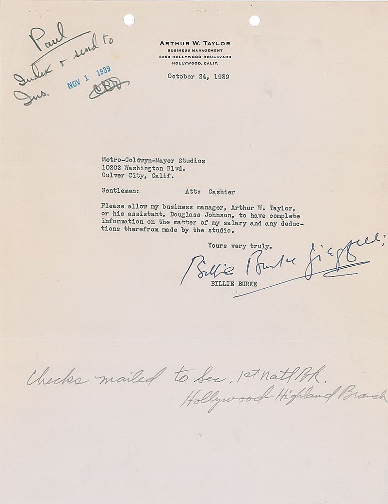 DS, boldly signed “Billie Burke Ziegfeld,” one page, 8.5 x 11, October 24, 1939. In the year of the release of The Wizard of Oz, Burke informs MGM Studios to allow her business manager “to have complete information on the matter of my salary and any deductions therefrom made by the studio.” In fine condition.