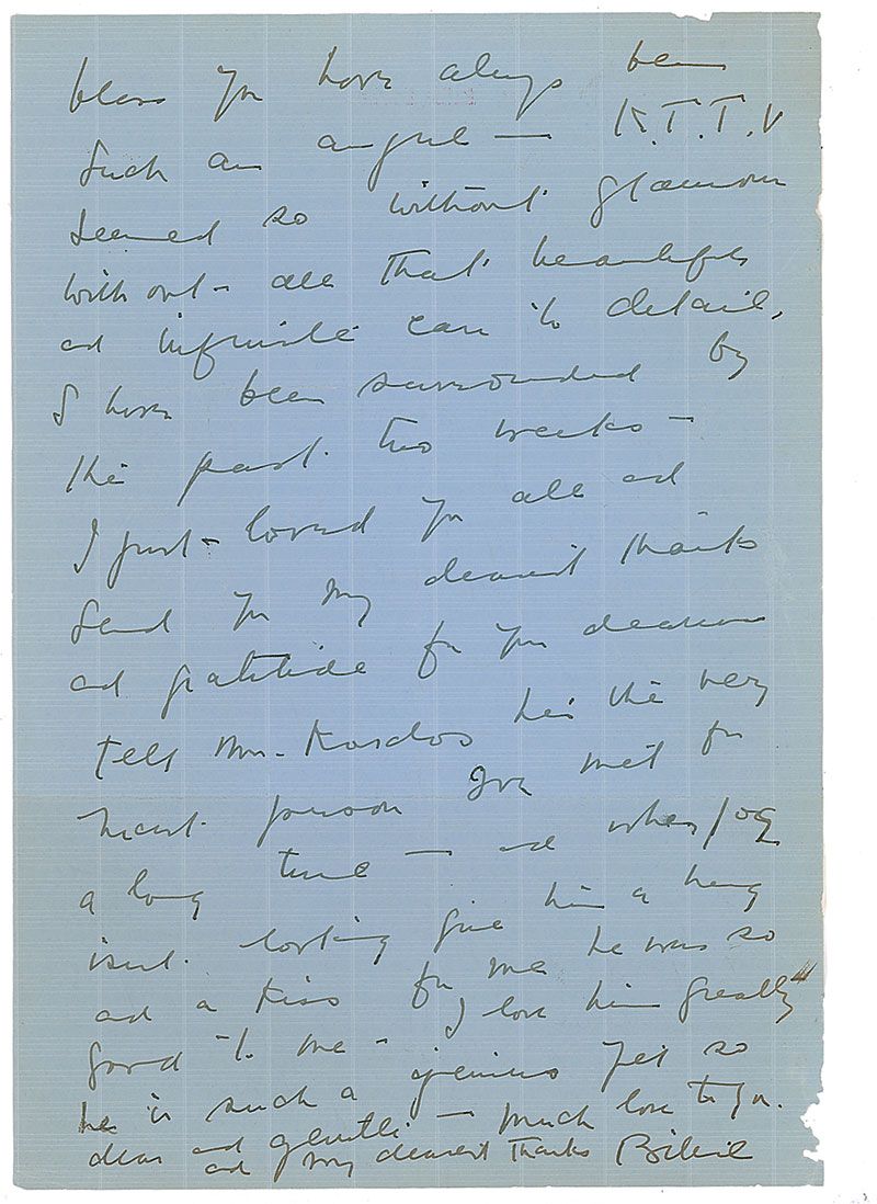 ALS signed “Billie,” one page both sides, 7.25 x 10.25, personal letterhead, no date. Letter to an unidentified woman thanking her for her help after a television production. In part: “You were so wonderfully kind all of you to help me hold my job down at K.T.T.V. I enjoyed being in your picture every day (except the first!!) was fantastically delightful. I loved it so—a dear group of darlings.” In very good condition, with toning to edges, tape to left edge, ink notation to top, and slight paper loss to corner near signature.