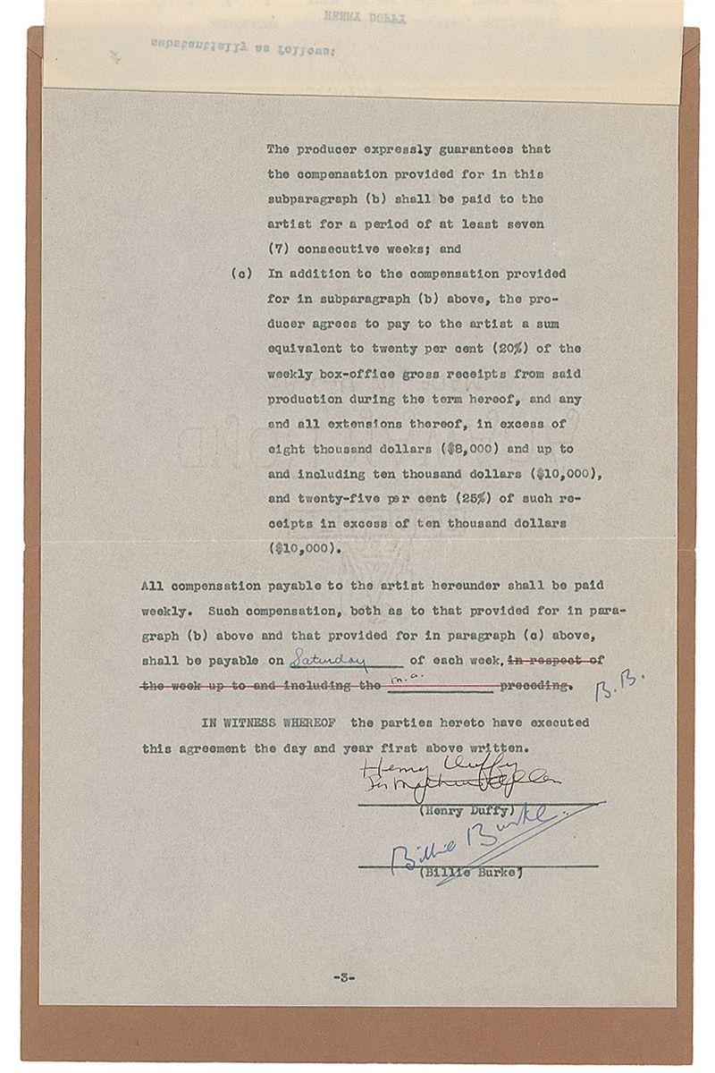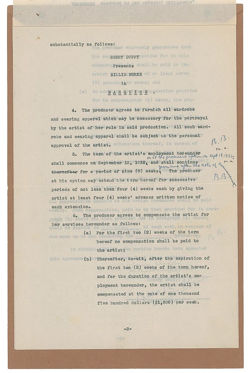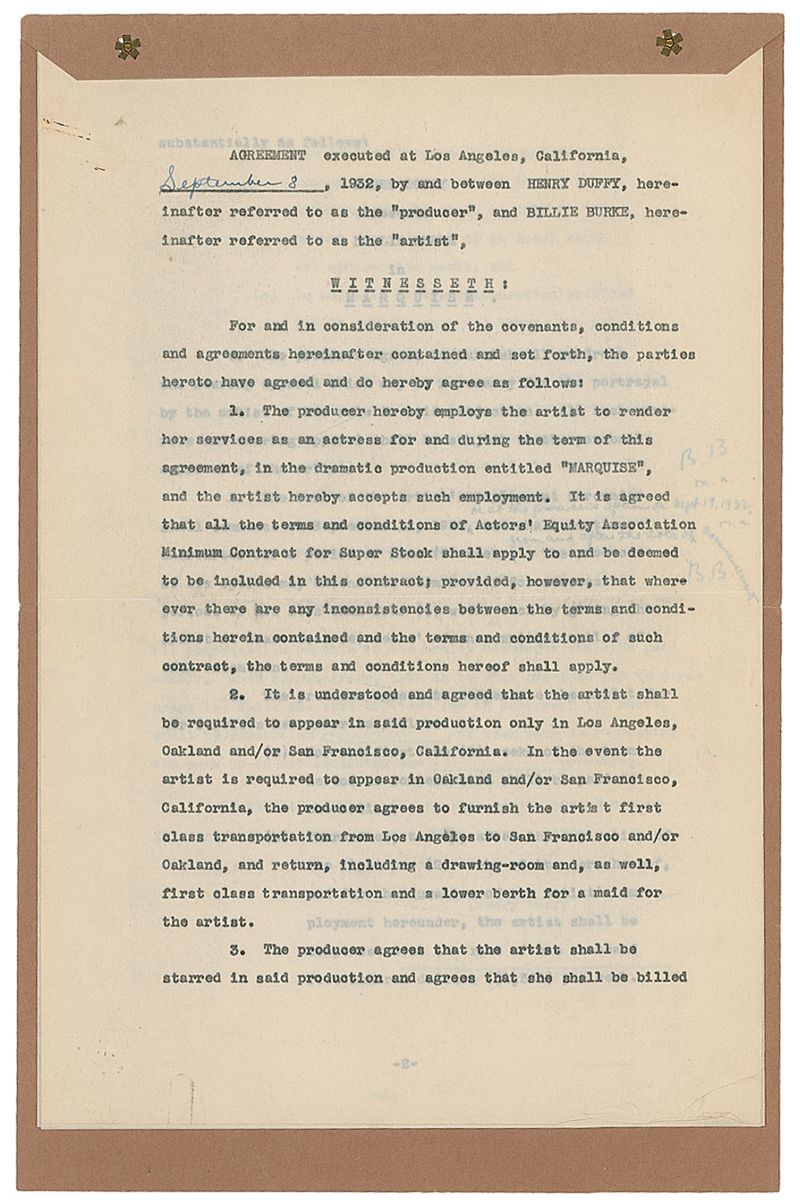 DS, three pages, 8.5 x 12.75, September 8, 1932. Agreement between Billie Burke and Henry Duffy for her to “render her services as an actress…in the dramatic production entitled ‘Marquise.’” Initialed three times throughout the text and nicely signed at the conclusion by Burke. Document is fastened at the top to its original folder. In fine condition.