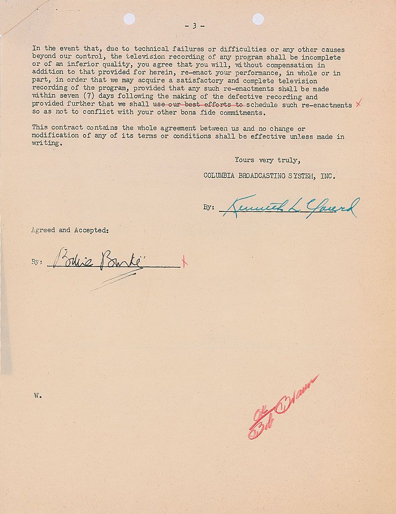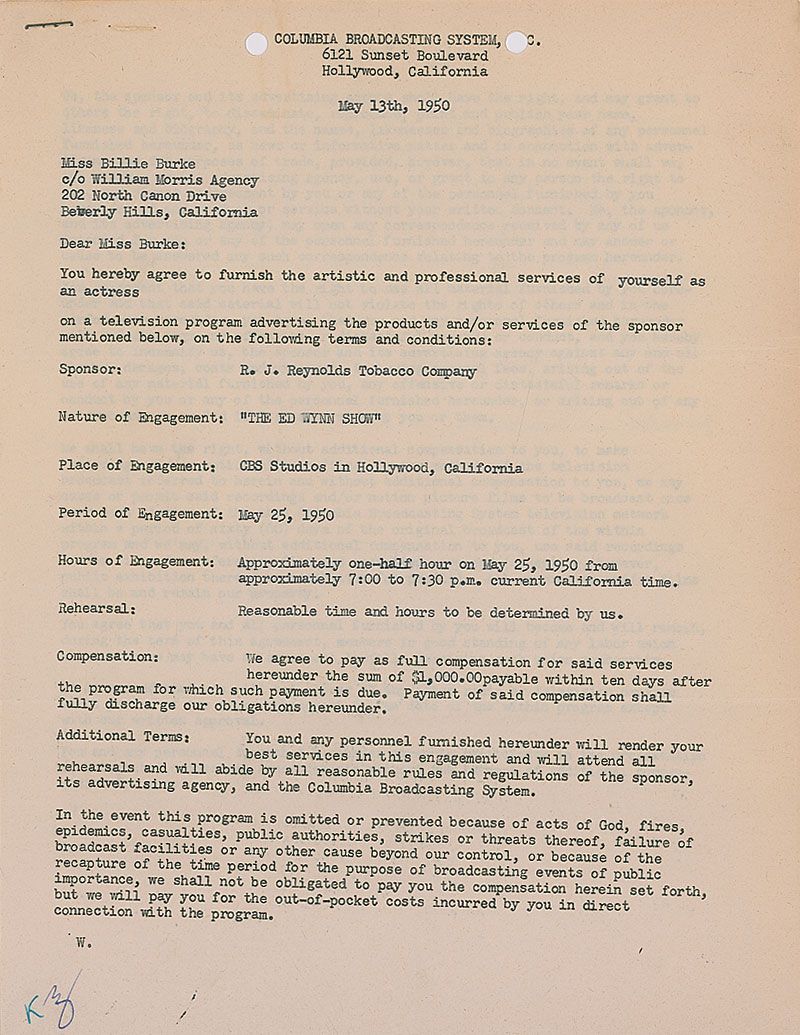DS, three pages, 8.5 x 11, May 13, 1950. Agreement between Burke and CBS for her to appear on an episode of The Ed Wynn Show on May 25, 1950, in exchange for $1000. Nicely signed at the conclusion in fountain pen. In fine condition, with uniform toning and expected document wear.
