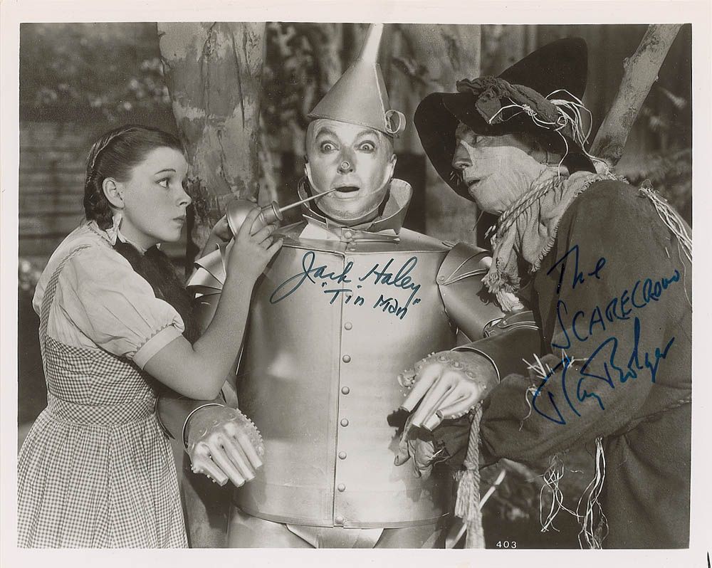 Classic glossy 10 x 8 photo of Dorothy with the Tin Man and Scarecrow, signed in blue felt tip, “Jack Haley, ‘Tin Man’” and “The Scarecrow, Ray Bolger.” In fine condition.