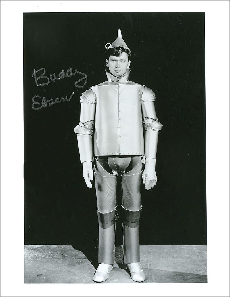 Uncommon glossy 8 x 10 full-length photo of Buddy Ebsen in costume as the Tin Man in The Wizard of Oz, signed in silver ink. In fine condition. Ebsen had the original role as the Tin Man in the 1939 film, but it lasted for only ten days due to a severe, life-threatening reaction to the silver metallic based make-up.