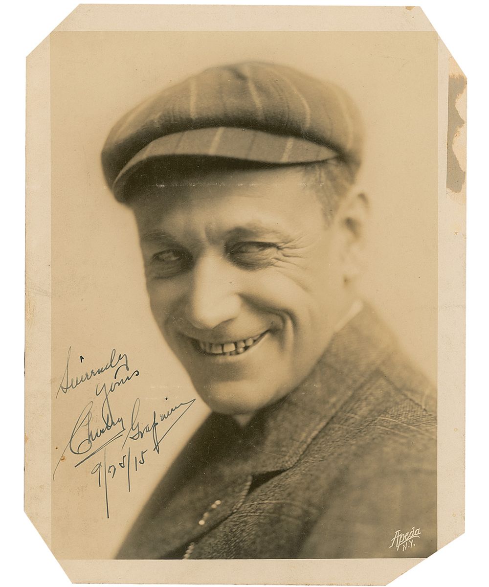 Character actor (1869–1956) best known for his role as Uncle Henry in The Wizard of Oz. Vintage pearl-finish 8 x 10 photo, signed in fountain pen, “Sincerely yours, Charley Grapewin, 9/25/15.” Clipped corners, mounting remnants in the upper right border, a vertical crease on the right side, scattered marks and soiling, and mounting remnants on reverse, otherwise very good condition.