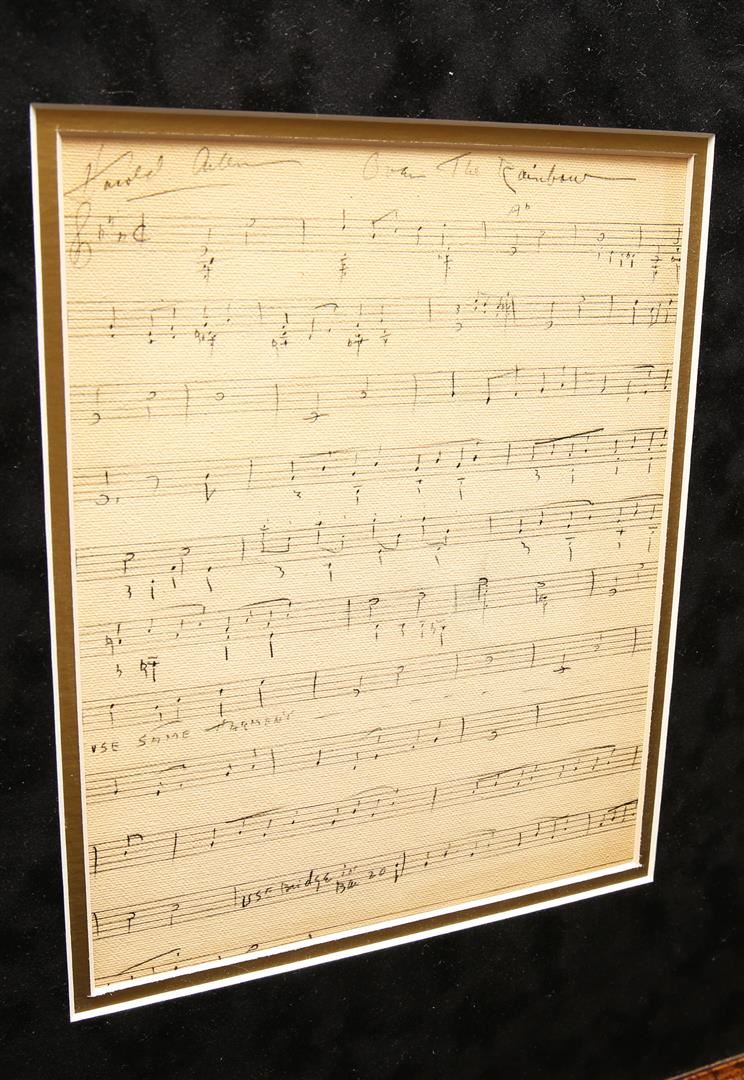 A Wizard of Oz collage with sheet music from "Over the Rainbow" autographed by Judy Garland. Dimensions: 44" Width x 44" Height.