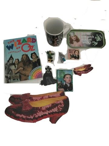 A unique collection of five Wizard of Oz magnets, a ruby slippers cardboard cutout to use as a gift card from 1991, and a Wizard of Oz cookbook from Hollywood hot plates published in 1993. Also included is an MGM licensed Wizard of Oz mini mug featuring the four iconic characters in the scene where they are deciding which way they should walk.