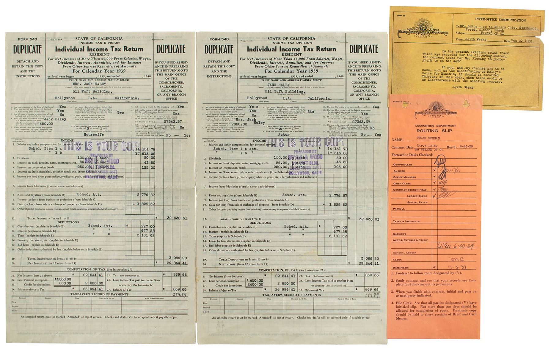 Three unsigned documents: unusual mimeograph MGM inter-office memo dated December 20, 1938, on the subject "Wizard of Oz," in part: "Is the present existing sound track which was recorded for the Jitterbug Number, the correct track for Mr. Fleming to photograph on the set?"; an MGM accounting department routing slip for Frank Morgan's contract for "Wizard of Oz," June-July 1939, circulated through various departments and initialed by auditors, clerks, and managers; and tax return documents for Jack Haley and his wife for 1939, each three pages, necessarily reflecting Haley's income from Wizard of Oz. In overall fine condition.