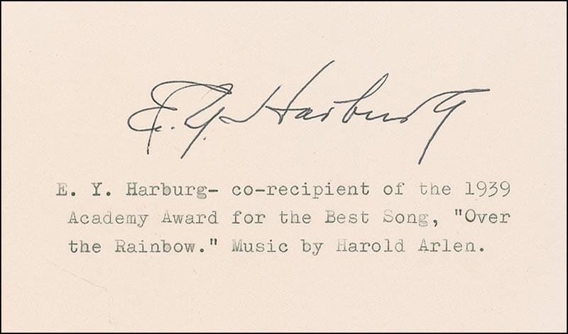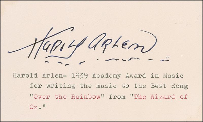 Ink signatures of ‘Over the Rainbow’ composers E. Y. Harburg and Harold Arlen on individual 5 x 3 off-white cards. In fine condition, with a vertical crease passing through Arlen’s name and typed biographical notation beneath each signature.