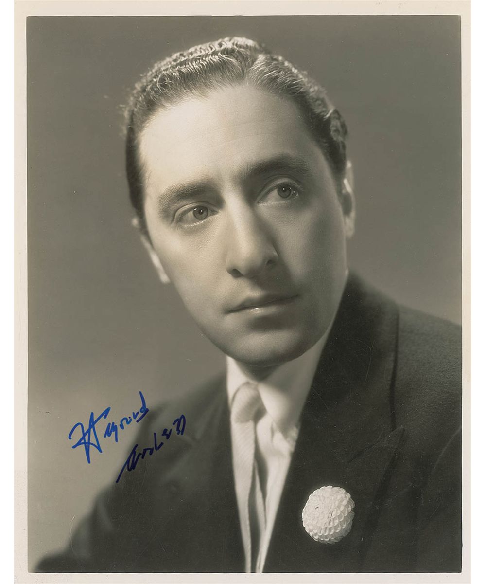 Distinguished American composer (1905–1986) best known for his songs for the film The Wizard of Oz. Fantastic glossy 8 x 10 publicity photo of Arlen in formal attire, signed in blue felt tip. In fine condition, with light scattered surface marks and impressions, and a promotional caption affixed to reverse.