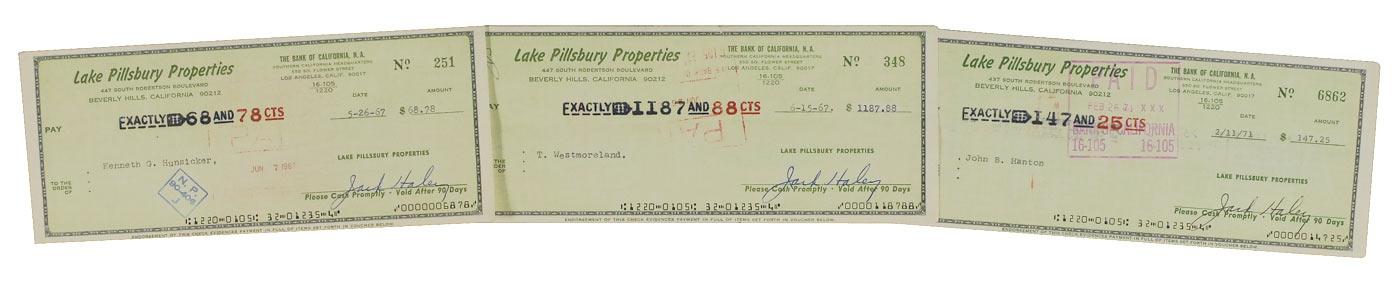 Three business checks from Lake Pillsbury Properties, all 8.5 x 3.5, dated from 1967 and 1971, and all filled out in type and signed by Haley. In fine condition, with expected stamps and cancellation holes.