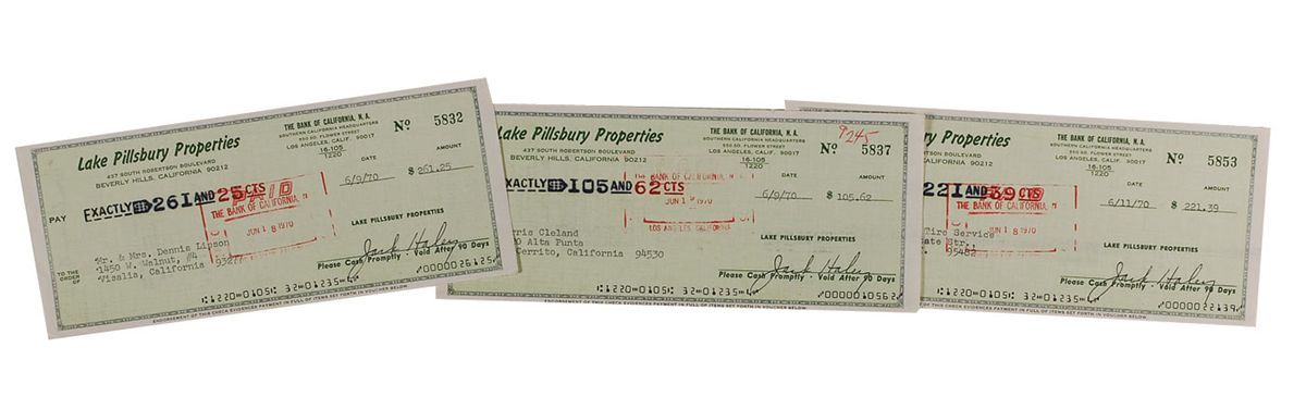 Three business checks from Lake Pillsbury Properties, all 8.5 x 3.5, all dated from July of 1970, and all filled out in type and signed by Haley. Expected stamps, and vertical folds to all checks, one through a single letter of signature, otherwise fine condition.