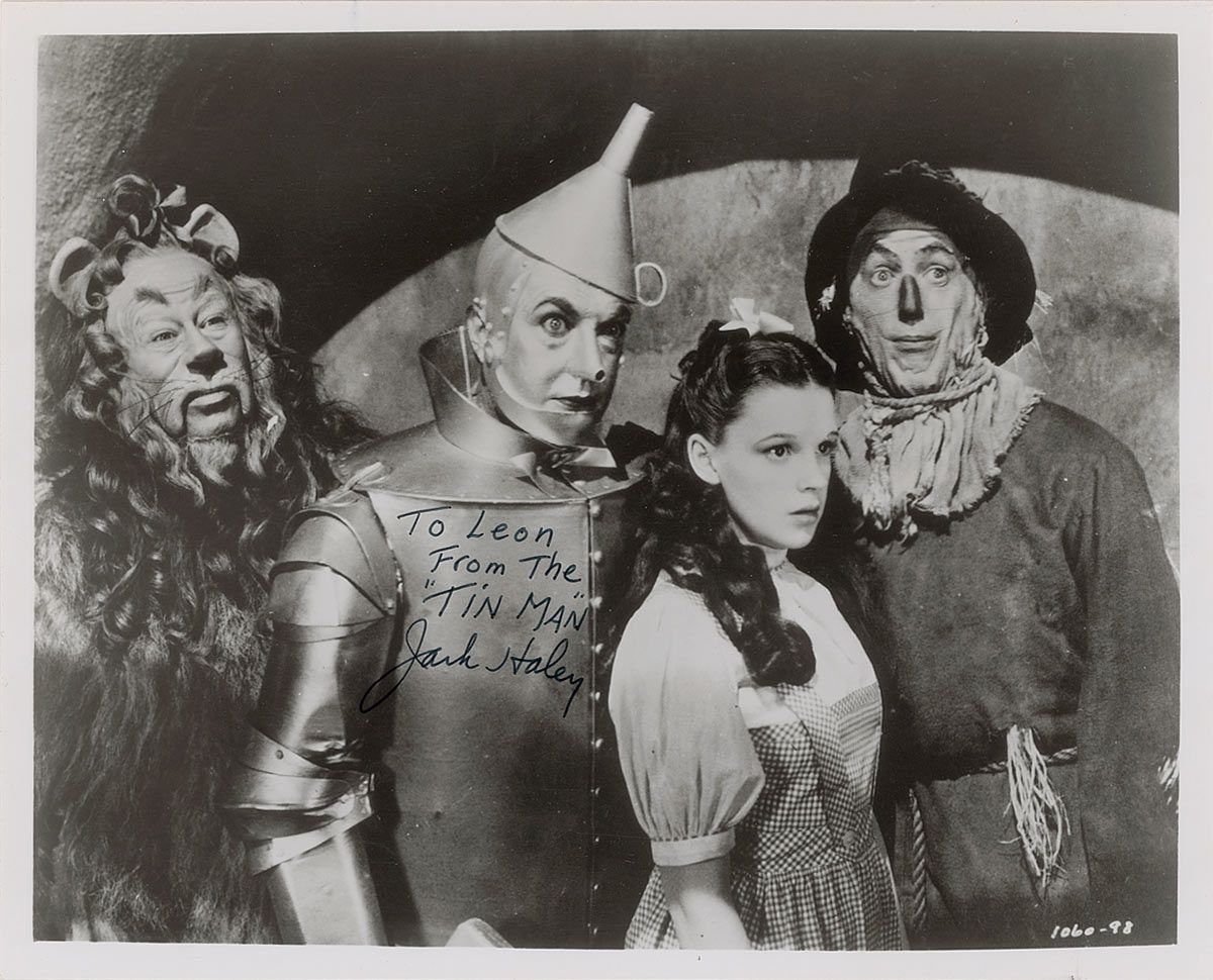 Glossy 10 x 8 photo from the film, signed and inscribed in black felt tip “To Leon from the ‘Tin Man’ Jack Haley.” In fine condition, with a few light dings and surface marks.