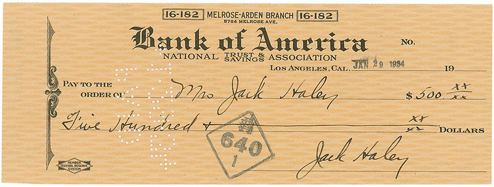 Bank check, 8.25 x 3, filled out and signed by Haley, payable to Mrs. Jack Haley for $500.00, stamp-dated January 29, 1934. In fine condition, with a central vertical fold and expected stamps and cancellation holes, none affecting the signature.