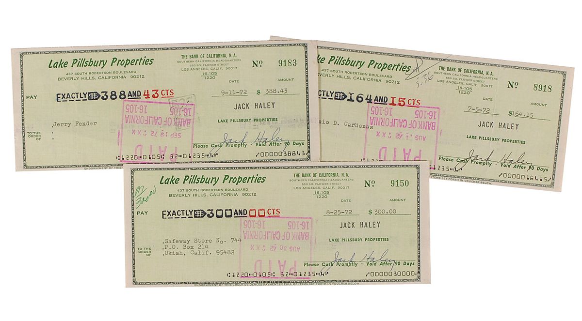 Three Lake Pillsbury Properties business checks, each filled out in type and signed by Haley, all dated from 1972. In very good condition, with a vertical fold to each and bank stamps and notations to all three checks.
