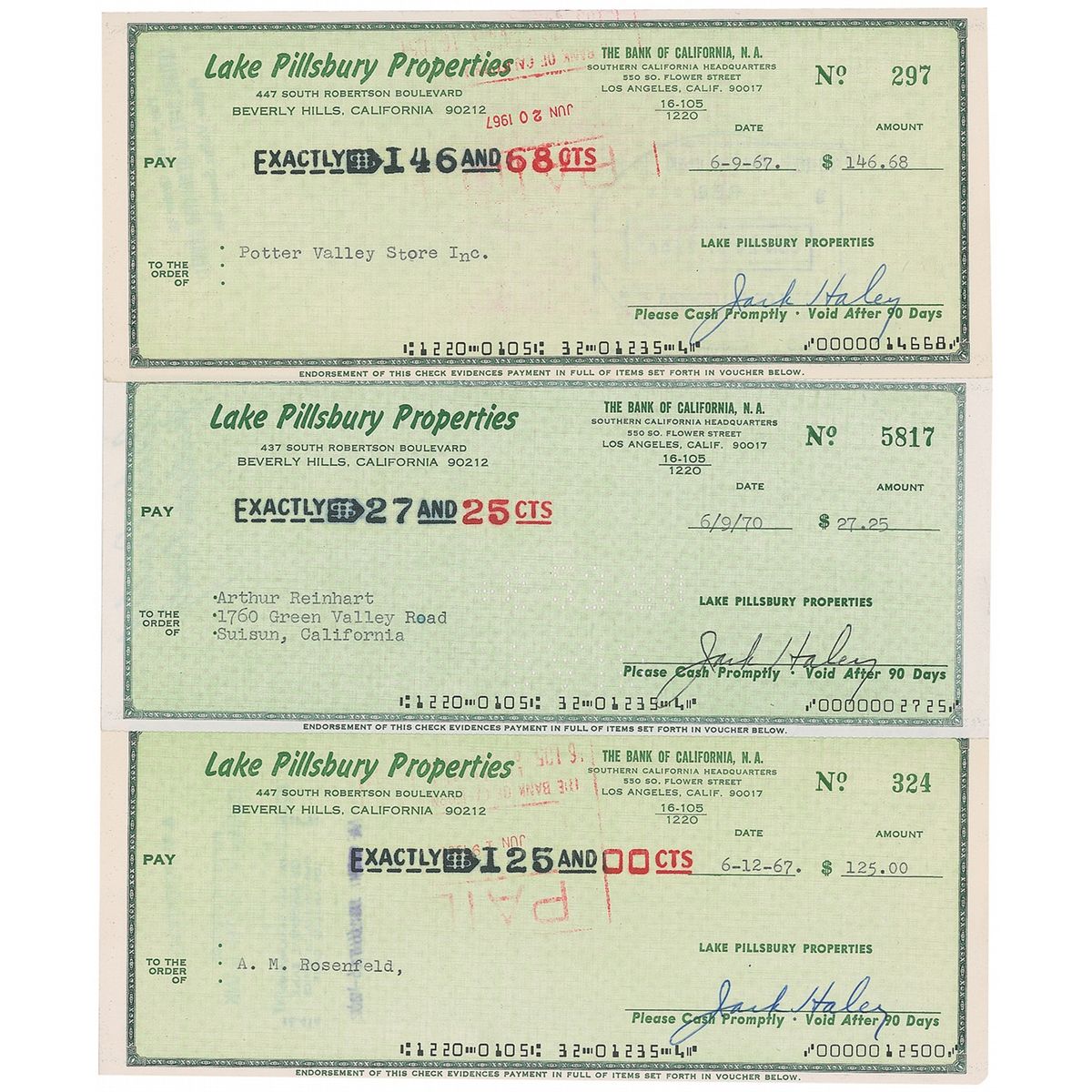Three business checks from Lake Pillsbury Properties, all 8.5 x 3.5, all dated from June of 1967 or 1970, and all filled out in type and signed by Haley. Expected stamps and cancellation holes, otherwise fine condition.