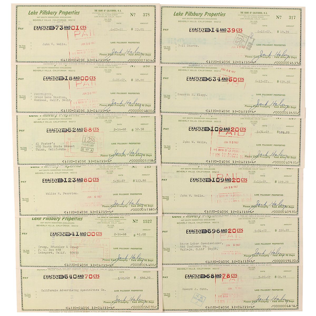 Twelve Lake Pillsbury Properties business checks, each filled out in type and signed by Haley, all dating from 1967 and 1968. In fine condition, with expected stamps.