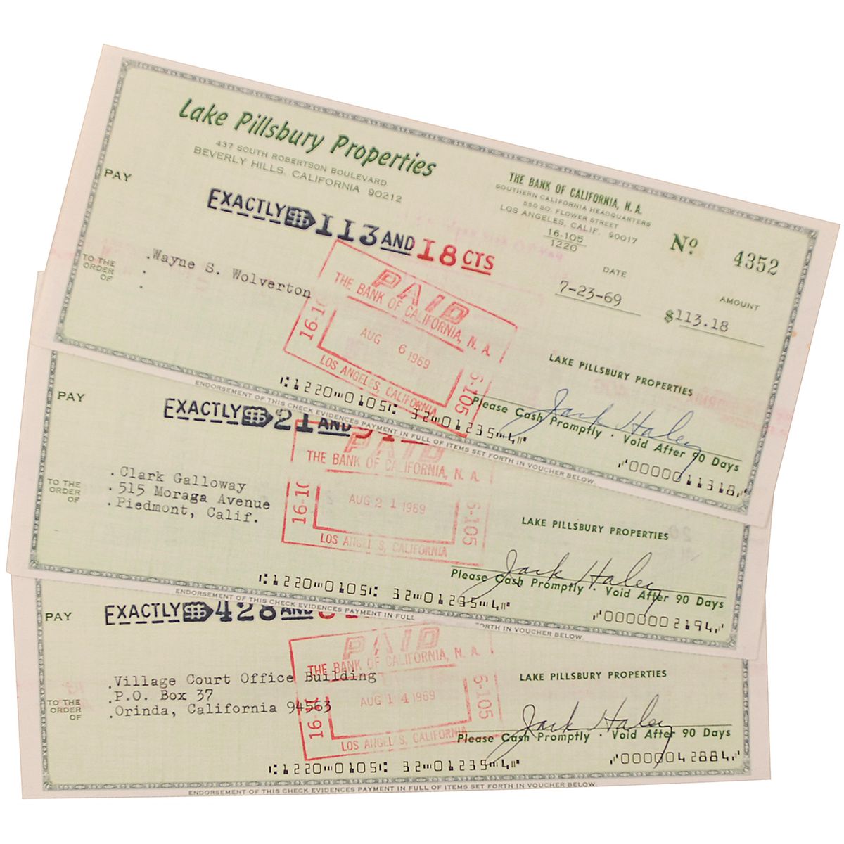 Three business checks from Lake Pillsbury Properties, all 8.5 x 3.5, all dated from July and August of 1969, and all filled out in type and signed by Haley. Expected stamps, and vertical fold to one check, otherwise fine condition.