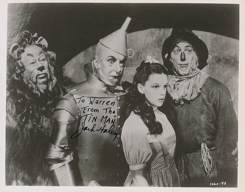 Glossy 10 x 8 photo from The Wizard of Oz , signed and inscribed in black felt tip, “To Warren, from the ‘Tin Man,’ Jack Haley.” Scattered creases and an irregularly trimmed top edge, otherwise fine condition.