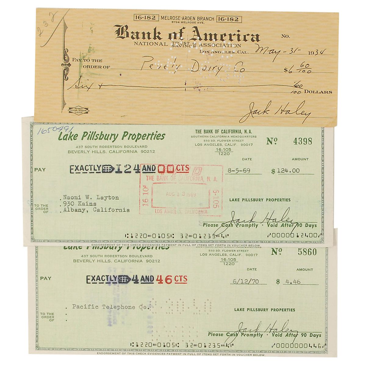 Three checks: two business checks from Lake Pillsbury Properties, 8.5 x 3.5, dated from 1969–1970, and all filled out in type and signed by Haley; and a bank check, 8.25 x 3, filled out and signed by Haley, dated May 31, 1934. In overall very good condition.