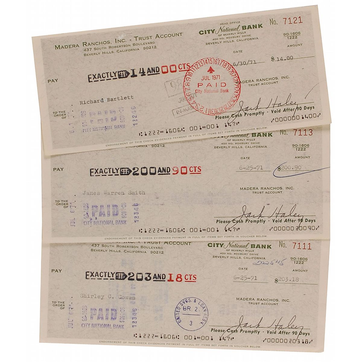 Three Madera Ranchos Inc. business checks, all 8.5 x 3.5, all filled out in type and signed by Haley, and dated June 1971. In fine condition, with various folds, one vertical fold passing through a single letter of the signature on one check, a staple hol